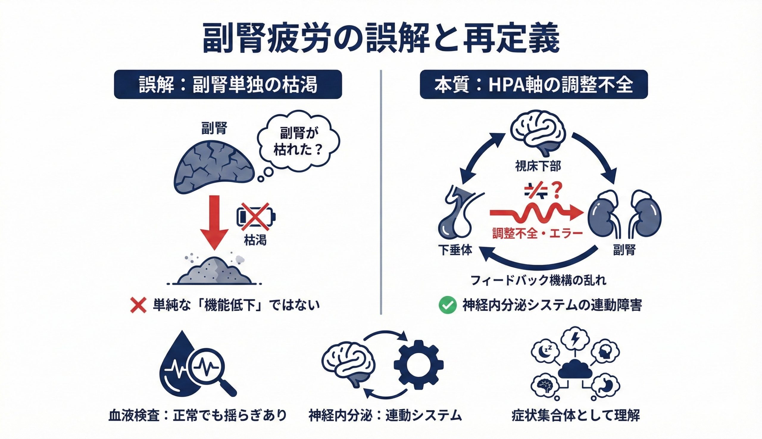 副腎疲労という言葉に振り回されるのではなく、神経内分泌系の調整不全という視点で全体を捉えることが重要です。