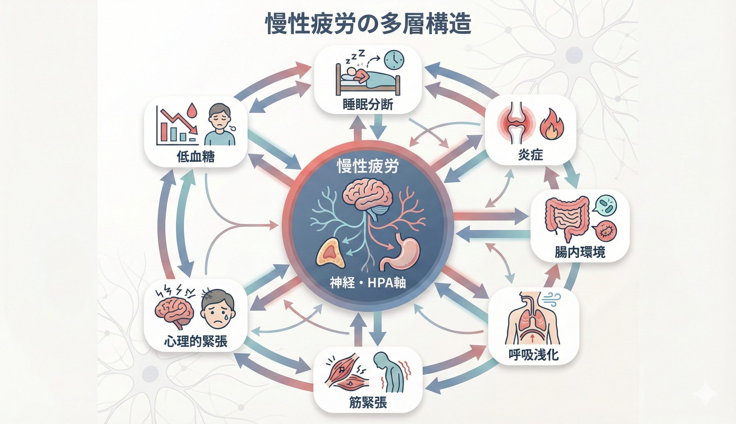 自律神経の過緊張、HPA軸の揺らぎ、血糖の乱れ、睡眠の分断、炎症の持続、心理的緊張が少しずつ積み重なった結果として現れます。