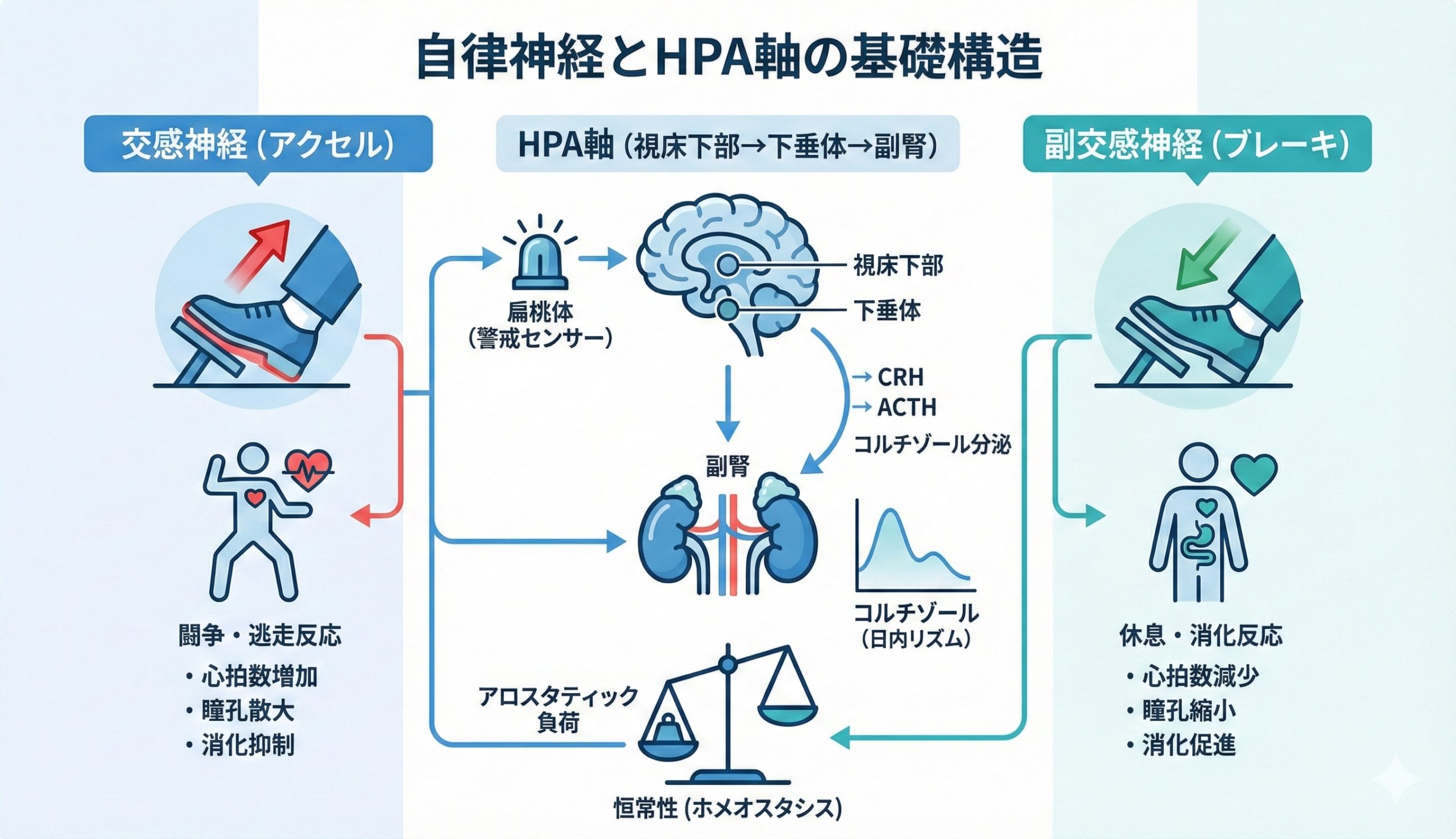 自律神経とHPA軸という、身体のストレス応答システムが長期間過負荷になった結果として起こることがあります。